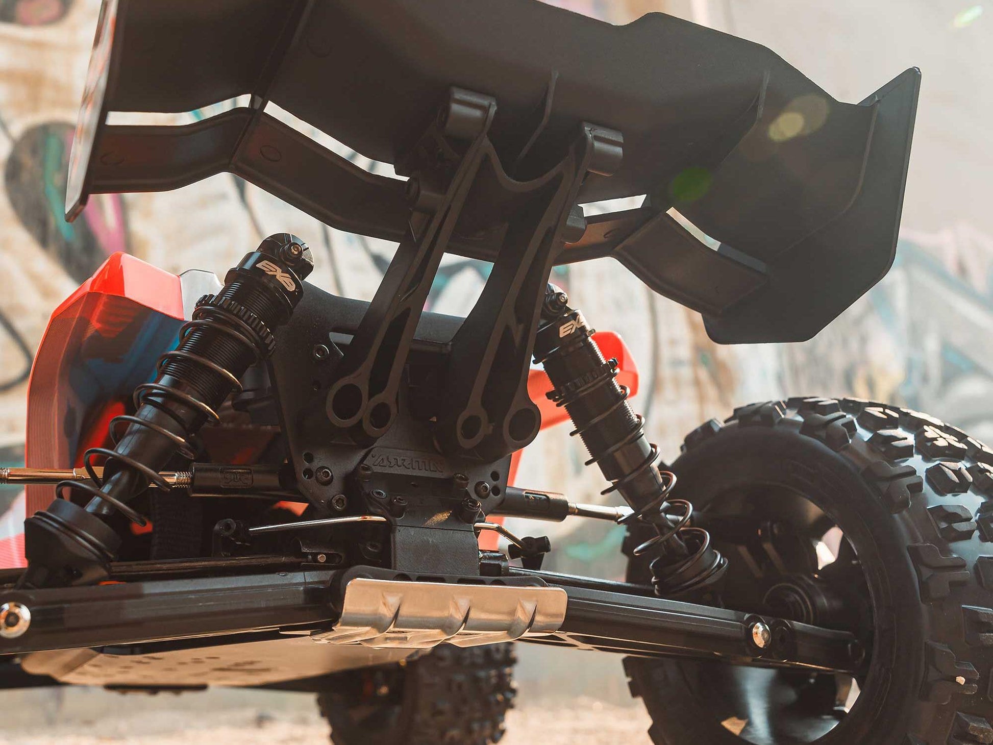 With an all-terrain independent suspension and adjustable 16mm oil-filled shocks on aluminium towers to soak up bumps, the KRATON 6S BLX 4X4 blasts over dirt, asphalt, and grass. If your bashing takes you over uneven surfaces, you can adjust the ride height to increase ground clearance.