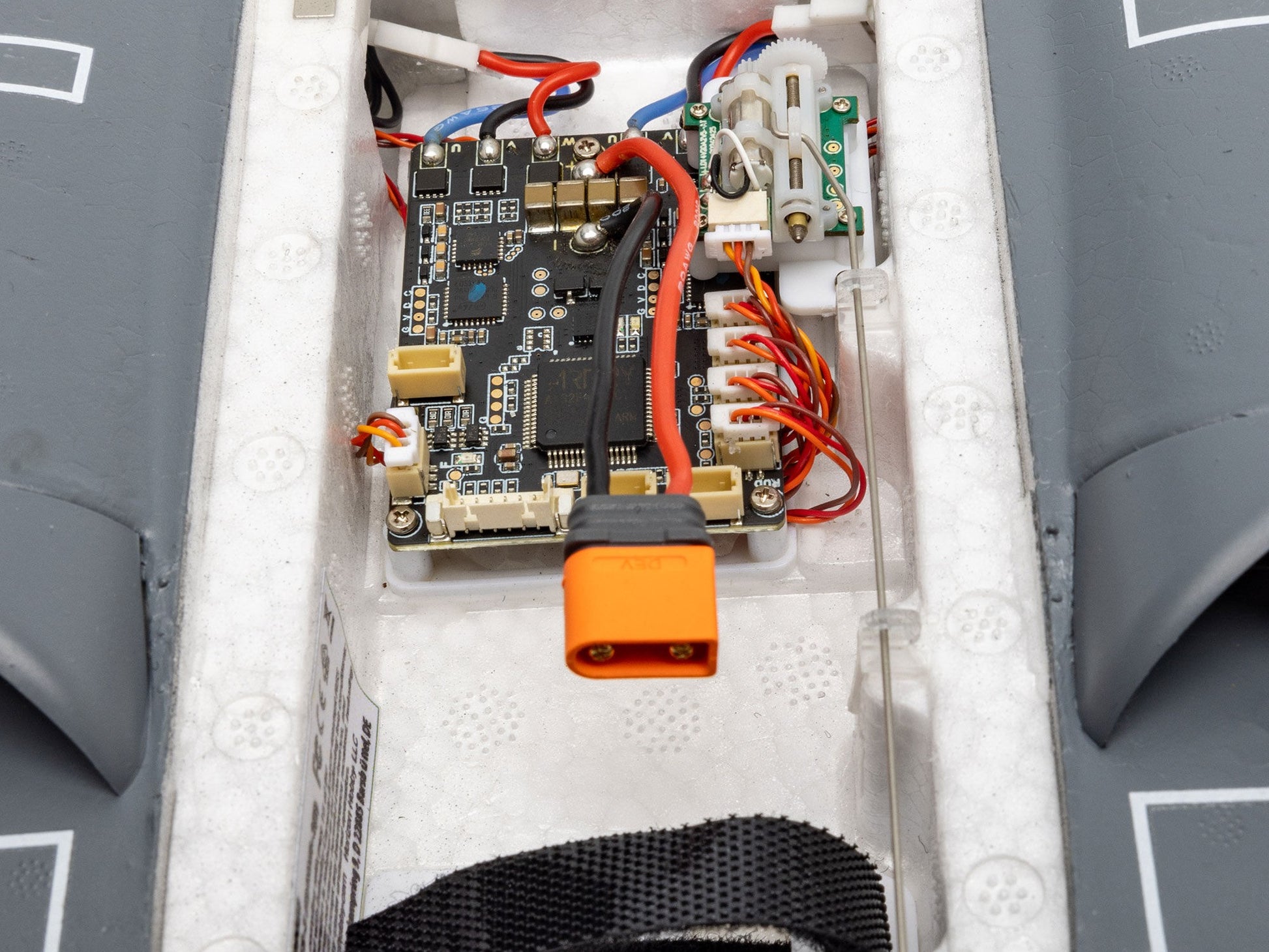 The factory-installed twin brushless power systems feature 30mm fans with powerful 3S-compatible outrunner motors. This power system setup delivers excellent speed and vertical performance, plus longer than average EDF flight times, when using the recommended 850mAh 30+C LiPo batteries with an IC2 connector.